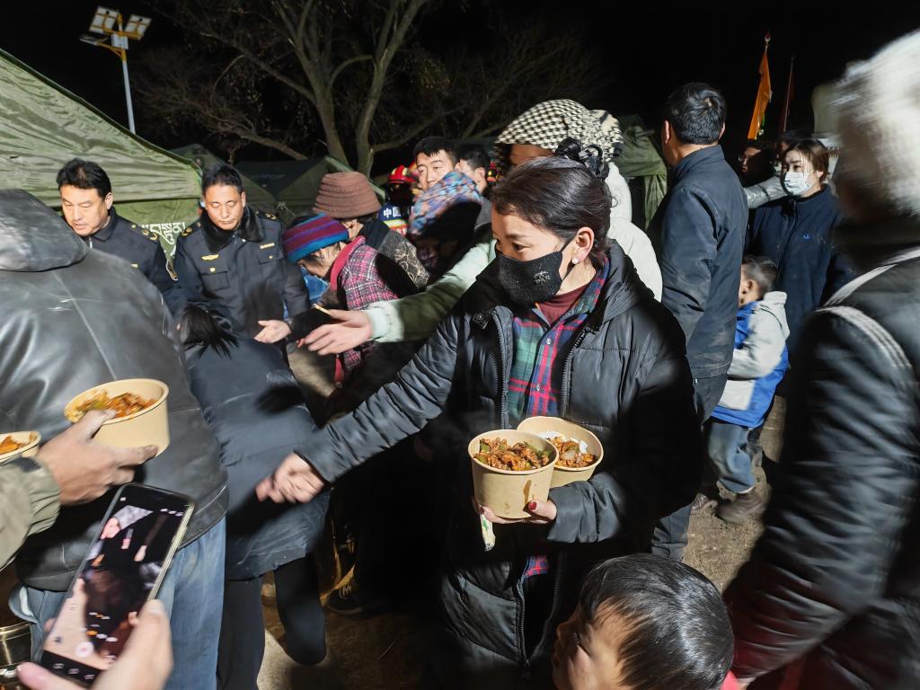 1月26日晚,在甘南州迭部县电尕镇哇曲村临时安置点,群众正在领取爱心餐食。新华社记者 崔翰超 摄