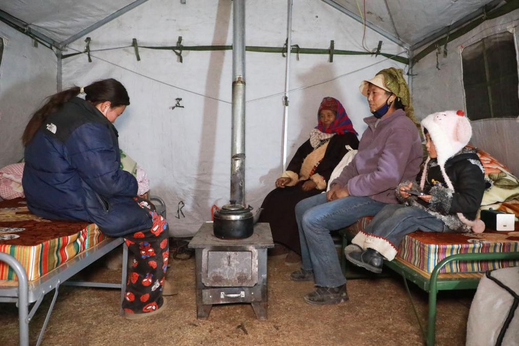 1月26日晚,在甘南州迭部县电尕镇哇曲村临时安置点,群众在应急帐篷内取暖休息。 新华社记者 张智敏 摄)