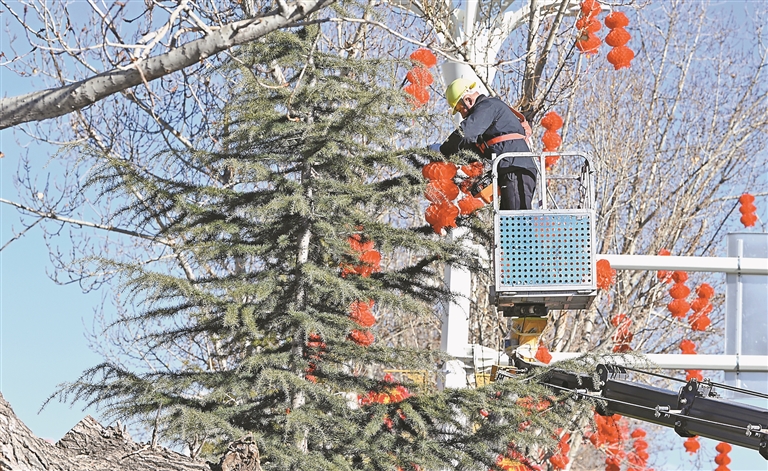 市政工人正在挂灯笼。记者 洛桑 唐斌 摄