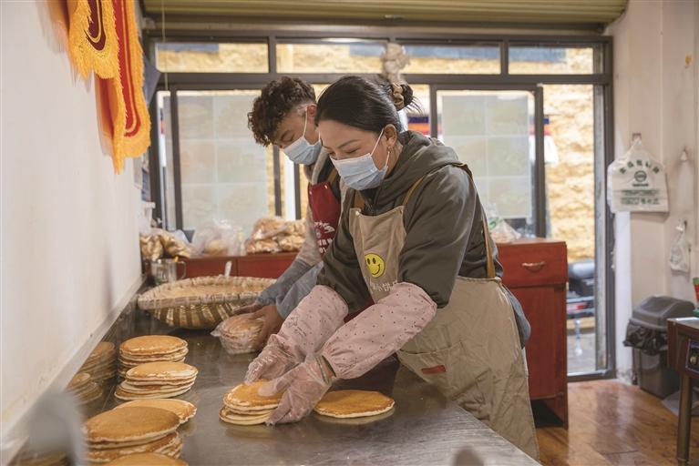 “卓嘎,我昨天预订的两袋红糖饼做好了没?”店门外,一位老顾客朝里喊话。“阿姨,做好啦!做好啦!”格桑卓嘎笑着应道,手脚麻利地打包、递过去。