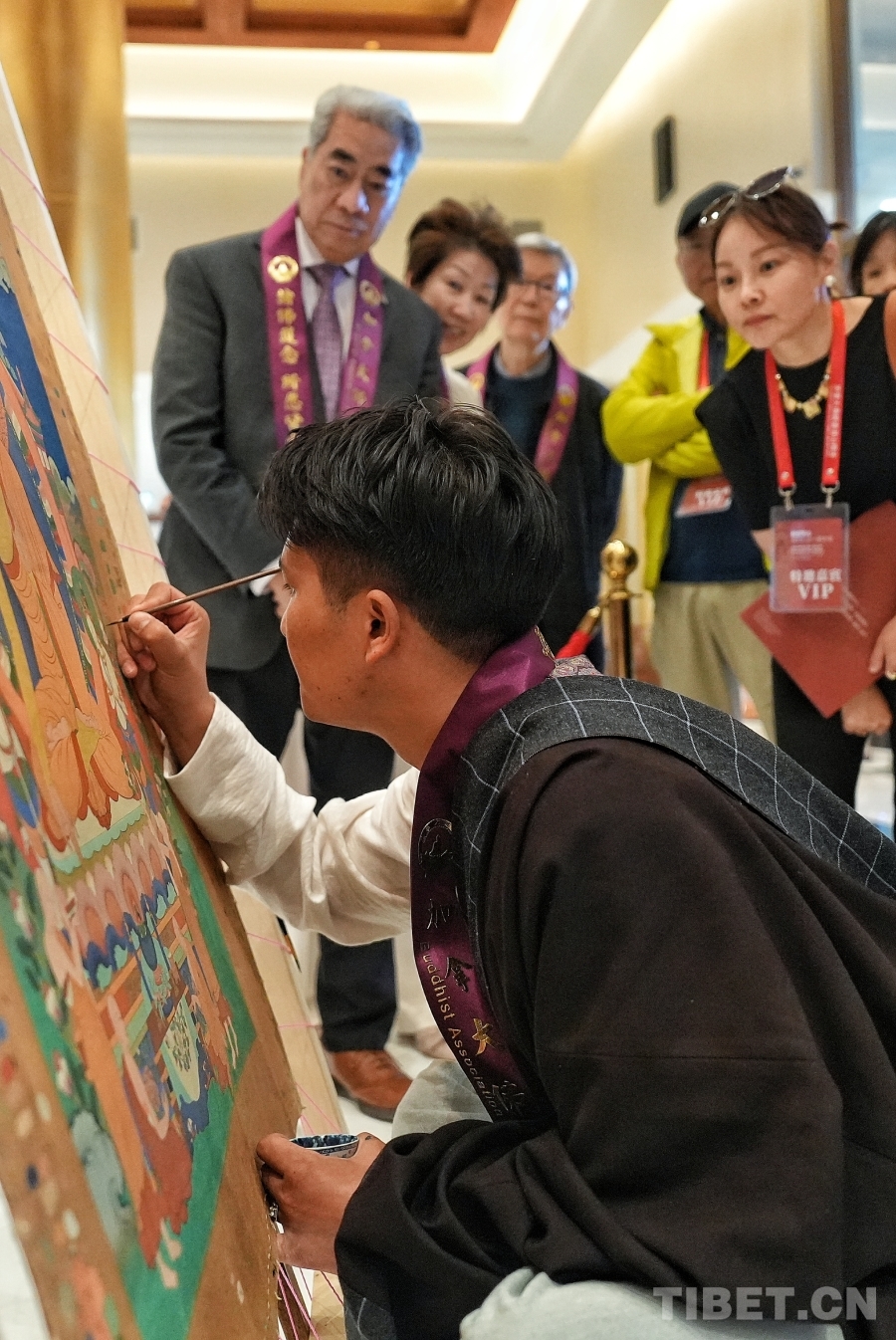 为了提升观展体验,展览特别设置了“唐卡技艺现场演示”环节。壤巴拉非遗传习协会青年艺术家申支足现场展示传统唐卡绘制过程,他专注而细腻的笔触,让观众得以近距离观察到非遗技艺的“匠心细节”,直观感受每一幅作品背后所沉淀的时间与文化心血,从而更深入地理解中国优秀传统艺术的创作逻辑。