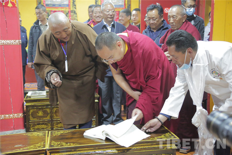 医药的发展关键是人才,十一世班禅首先来到了博物馆内的专家门诊室和学术讲座厅。在学术讲座厅内,十一世班禅俯身拿起桌上学员的笔记认真地翻阅。随后,十一世班禅进入药材厅、藏医器械展厅、药材标本室、羌塘名医传承介绍厅、藏医古迹医典厅、医算唐卡厅、天文历算厅等进行了参观调研。嘉黎县藏医院专家向十一世班禅详细介绍了嘉黎县藏医药历史文化博物馆建馆情况及展示的各类文物级珍贵展品。