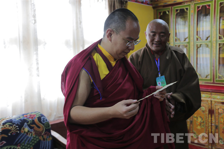 图为十一世班禅在学术讲座厅翻阅学员笔记 摄影:王淑