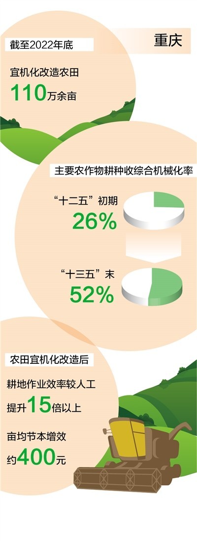 2015年起,重庆着眼于提升农业机械化水平,探索推进丘陵山区农田宜机化改造。截至2022年底,重庆已对110万余亩农田进行了宜机化改造,主要农作物耕种收综合机械化率由“十二五”初期的26%提高到“十三五”末的52%。