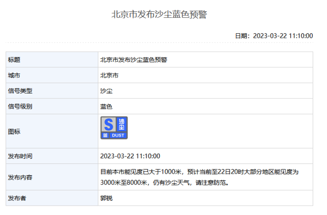 央视网消息:北京市气象台2023年3月22日11时10分降级发布沙尘蓝色预警信号:目前本市能见度已大于1000米,预计当前至22日20时大部分地区能见度为3000米至8000米,仍有沙尘天气,请注意防范。
