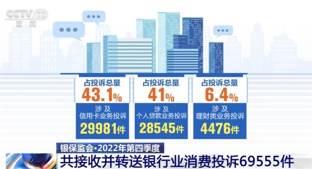 2022年第四季度,中国银保监会及其派出机构共接收并转送银行业消费投诉69555件。其中,涉及信用卡业务投诉29981件,占投诉总量的43.1%;涉及个人贷款业务投诉28545件,占投诉总量的41%;涉及理财类业务投诉4476件,占投诉总量的6.4%。