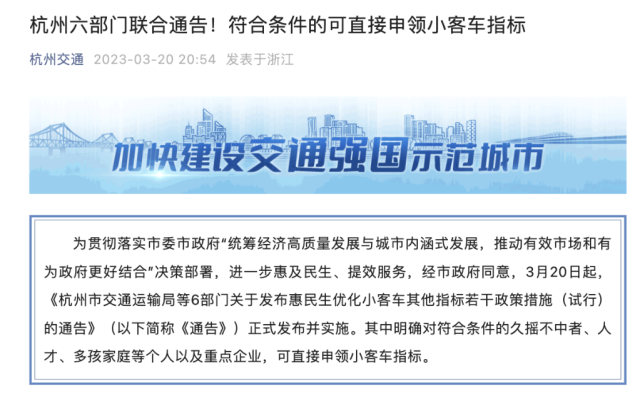 20日晚,杭州市交通运输局等6部门发布通告明确,即日起,符合条件的“久摇不中”者、多孩家庭等个人以及重点企业,可直接申领小客车指标。
