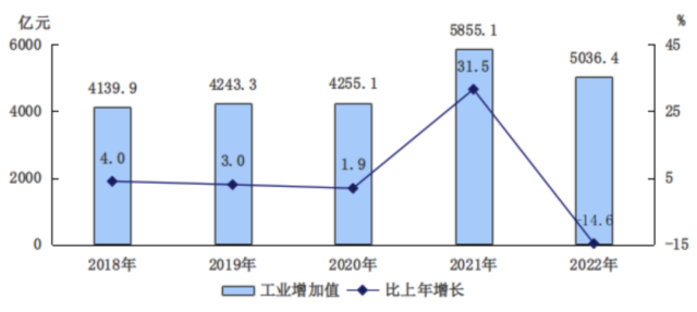 全年实现工业增加值5036.4亿元,按不变价格计算,比上年下降14.6%。其中,规模以上工业[4]增加值下降16.7%,剔除新冠疫苗生产因素增长2.5%。在规模以上工业中,电力、热力生产和供应业增长9.8%,计算机、通信和其他电子设备制造业增长3.6%,汽车制造业下降2.6%,医药制造业下降58.3%(剔除新冠疫苗生产因素后增长6.4%)。规模以上工业实现销售产值22366.3亿元,下降5.7%。其中,内销产值20560.5亿元,下降1.8%;出口交货值1805.8亿元,下降35.0%。