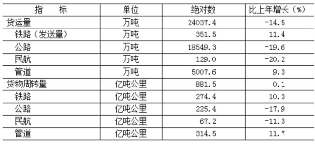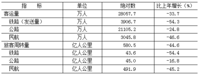 全年货运量24037.4万吨,比上年下降14.5%;货物周转量881.5亿吨公里,增长0.1%。全年客运量28057.7万人,下降33.7%;旅客周转量580.5亿人公里,下降44.6%。