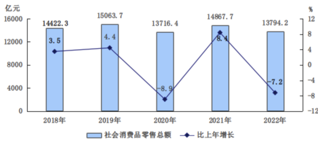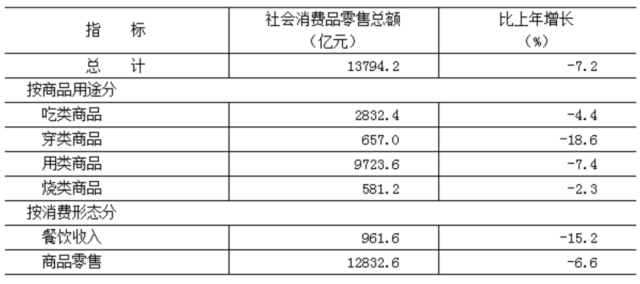 全年市场总消费额比上年下降4.9%。其中,服务性消费额下降2.9%;实现社会消费品零售总额13794.2亿元,下降7.2%。