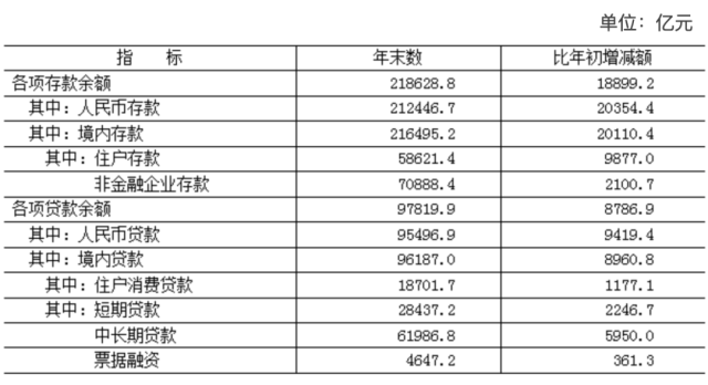 年末全市金融机构(含外资)本外币存款余额218628.8亿元,比年初增加18899.2亿元。全市金融机构(含外资)本外币贷款余额97819.9亿元,比年初增加8786.9亿元。