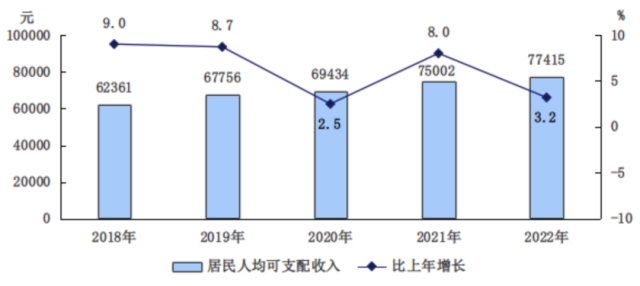 全年全市居民人均可支配收入为77415元,比上年增长3.2%,扣除价格因素,实际增长1.4%。