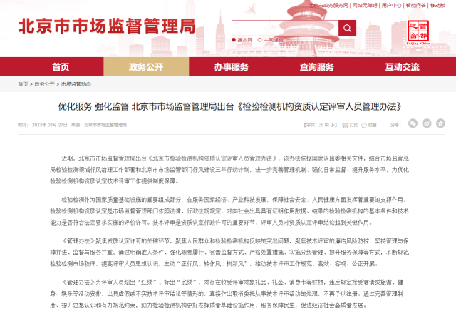 近期,北京市市场监督管理局出台《北京市检验检测机构资质认定评审人员管理办法》,该办法依据国家认监委相关文件,结合市场监管总局检验检测领域行风治理工作部署和北京市市场监管部门行风建设三年行动计划,进一步完善管理机制、强化日常监督、提升服务水平,为优化检验检测机构资质认定技术评审工作提供制度保障。