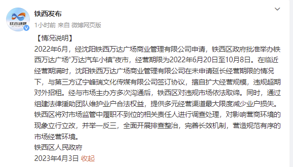 央视网消息:据@铁西发布 微博4月3日消息,铁西区人民政府发布情况说明。2022年6月,经沈阳铁西万达广场商业管理有限公司申请,铁西区政府批准举办铁西万达广场“万达汽车小镇”夜市,经营期限为2022年6月20日至10月8日。在临近经营期满时,沈阳铁西万达广场商业管理有限公司在未申请延长经营期限的情况下,与第三方辽宁峰瑞文化传媒有限公司签订协议,擅自扩大经营规模,违规超期对外招租。经与市场主办方多次沟通后,铁西区对违规市场依法取缔。同时,通过组建法律援助团队维护业户合法权益,提供多元经营渠道最大限度减少业户损失。