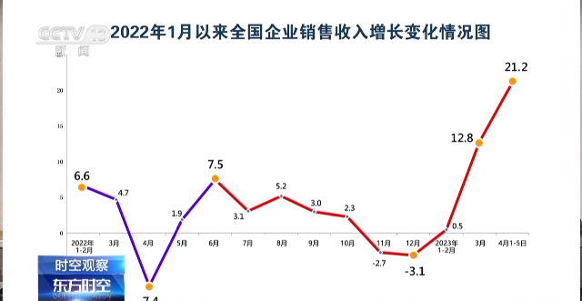 国家税务总局局长 王军:企业前有较多购进,意味着后有较大销售,加之去年4月基数较低和宏观调控经济政策持续显效,可以肯定地讲,4月份企业销售收入同比增幅比3月份还会高一些。4月1到5日的数据显示,企业销售收入增幅已经同比上升到了21.2%的高点上。我国经济在开年之季的态势总体向好、逐月向好,而且在持续向好。