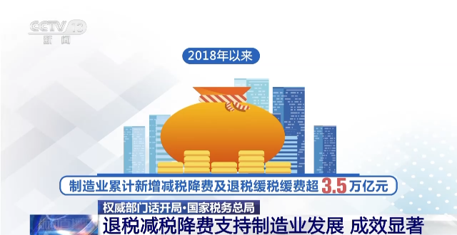 据介绍,在一系列退税减税降费举措中,下调制造业等领域的增值税税率、率先提高制造业研发费用加计扣除比例、加大制造业增值税留抵退税力度等减负措施,有效支持了制造业缓解经营压力、增强创新动力、激活发展潜力。