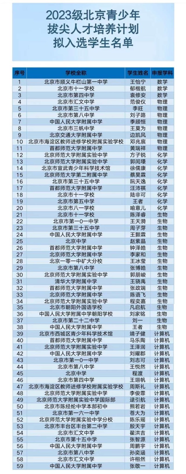 中国青年报客户端北京4月10日电(中青报·中青网记者 樊未晨)记者今天从北京市教委官方微信“首都教育”获悉,59名中学生入选“北京青少年拔尖人才培养计划”。