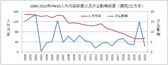 2000-2022年PM10人为污染浓度以及沙尘影响浓度变化图。图片来源:北京市生态环境监测中心