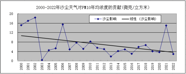 2000-2022年沙尘天气对PM10年均浓度贡献变化图。图片来源:北京市生态环境监测中心