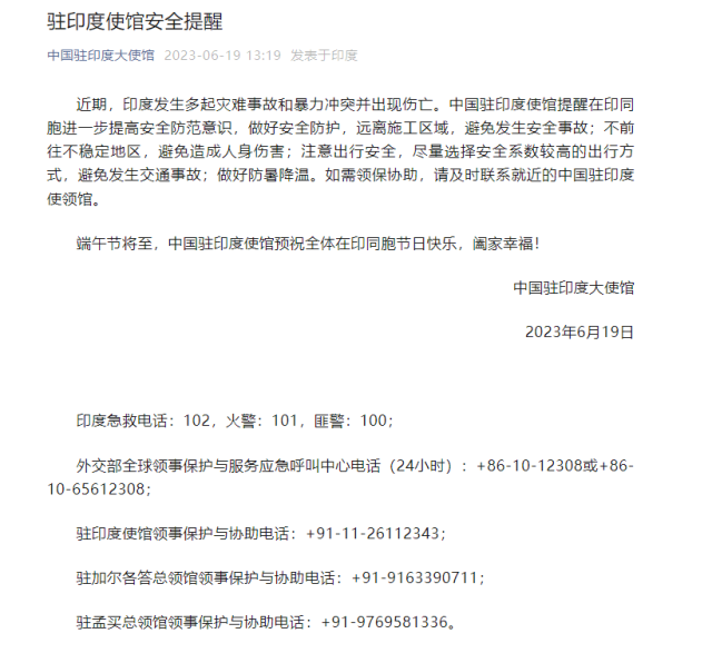 央视网消息:中国驻印度大使馆官微6月19日发布安全提醒,内容如下: