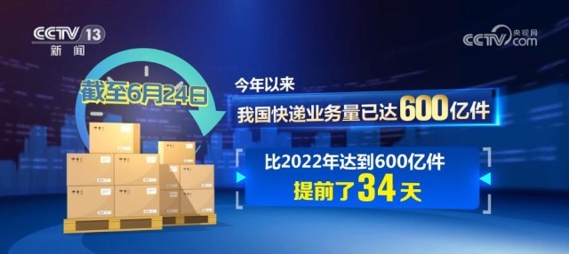 国家邮政局数据显示,截至6月24日,今年以来我国快递业务量已达600亿件,比2022年达到600亿件提前了34天。