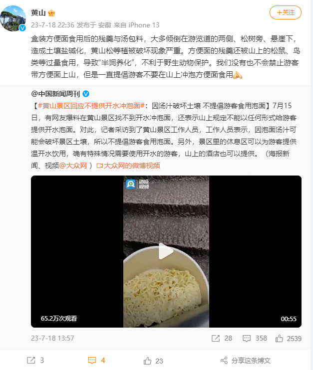 为何不提倡冲方便面?黄山景区:残羹破坏土壤,不利动物保护
