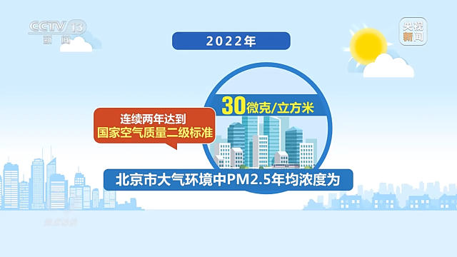 党的十八大以来,北京市坚决打好污染防治攻坚战,大力压减燃煤、治理机动车排放、挥发性有机物以及各类扬尘污染,实施“一微克”行动,治理成效显著,蓝天越来越多。监测结果显示,2022年,北京市大气环境中PM2.5年均浓度为每立方米30微克,比2013年下降了66.5%,连续两年达到国家空气质量二级标准。重污染天数由2013年的58天减少到2022年的3天,“北京蓝”成为常态。