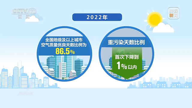 不仅北京,十年来,全国重点城市PM2.5平均浓度下降57%。2022年,全国地级及以上城市空气质量优良天数比例为86.5%,重污染天数比例首次下降到1%以内。我国成为全球大气质量改善速度最快的国家,蓝天保卫战正在给百姓带来实实在在的幸福感。