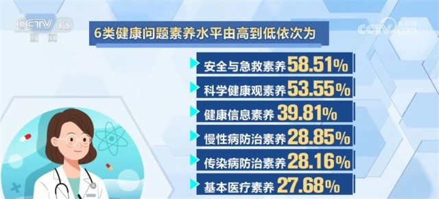 6类健康问题素养水平由高到低依次为:安全与急救素养58.51%、科学健康观素养53.55%、健康信息素养39.81%、慢性病防治素养28.85%、传染病防治素养28.16%和基本医疗素养27.68%。各类健康问题素养均有不同程度提升,其中,健康信息素养水平增幅最大,较2021年提升了3.88个百分点。本次监测覆盖31个省(自治区、直辖市)的336个县(区)1008个乡镇(街道),对象为15—69岁常住人口。