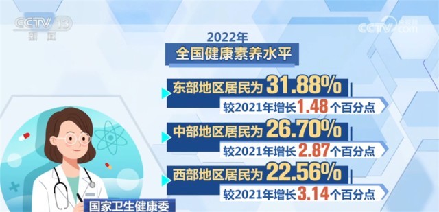 监测结果显示,2022年,全国城市居民健康素养水平为31.94%,农村居民为23.78%,较2021年分别增长1.24和1.76个百分点。东、中、西部地区居民健康素养水平分别为31.88%、26.70%和22.56%,较2021年分别增长1.48、2.87和3.14个百分点。城乡居民基本知识和理念素养水平为41.26%,健康生活方式与行为素养水平为30.63%,基本技能素养水平为26.00%,较2021年分别提升3.60、2.58、1.72个百分点。
