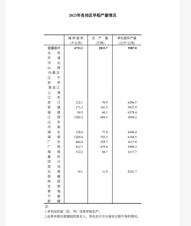 国家统计局今天发布数据显示,2023年,全国早稻总产量566.7亿斤,比2022年增加4.3亿斤,增长0.8%。全国早稻播种面积7099.7万亩,单位面积产量399.1公斤/亩,比2022年增加4.8公斤/亩,增长1.2%。