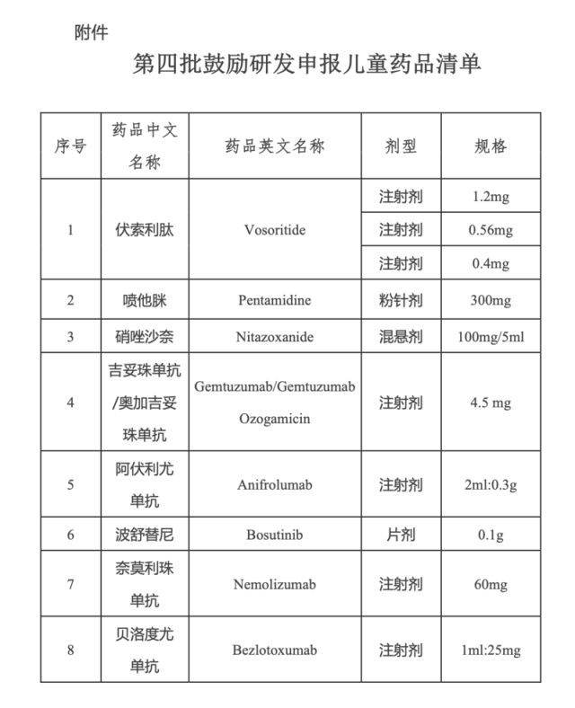 国家卫健委发布的相关政策解读中指出,《第四批清单》中的药品在遴选时,跟进全球最新临床进展,将近年来国外已上市国内未上市的儿童药品和国内已上市但无儿童适宜剂型规格药品作为重点考虑,着重选择安全性、有效性、适宜性高的品种。例如治疗白血病的吉妥珠单抗、波舒替尼等药品。