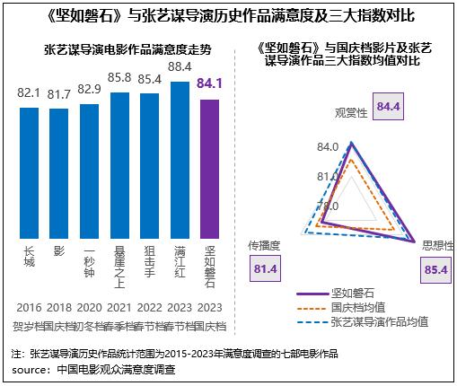 张艺谋导演新作《坚如磐石》获得观众满意度评分84.1分,居2023年国庆档调查五部影片首位,也是档期内唯一一部满意度超84分的影片,保持了张艺谋导演系列电影作品的高满意度水平。
