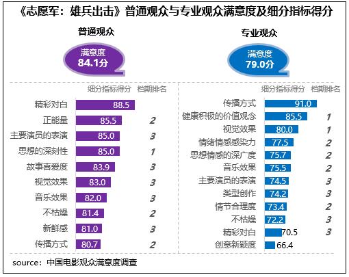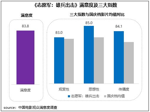 陈凯歌执导的抗美援朝题材影片《志愿军:雄兵出击》观众满意度83.8分,与档期第一名分差仅0.3分。
