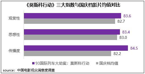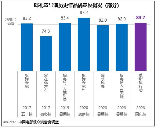 邱礼涛导演执导的警匪动作电影《93国际列车大劫案:莫斯科行动》获得观众满意度评分83.7分,与档期第一名和第二名仅差0.4分和0.1分;在满意度调查过的邱礼涛导演七部影片中,《莫斯科行动》满意度处在平均水平之上。
