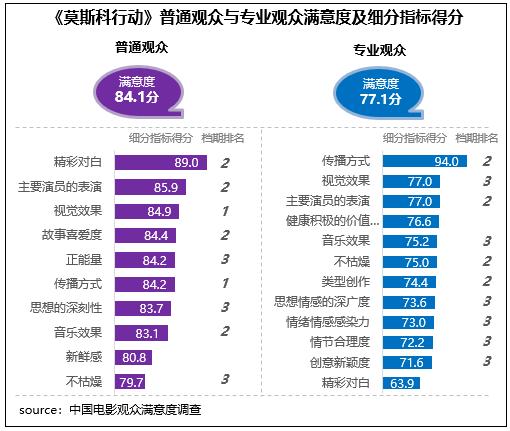 在不同观众评价上,《莫斯科行动》相对更受普通观众青睐,普通观众满意度得分84.1分,居档期第二位,与《坚如磐石》相差0.1分;专业观众满意度得分77.1分,居档期第三位。在细分指标中,影片视觉效果和主要演员的表演均得到了不同观众的高度认可,得分为各自评价指标体系的前三名,也都居档期五部影片的前三位。