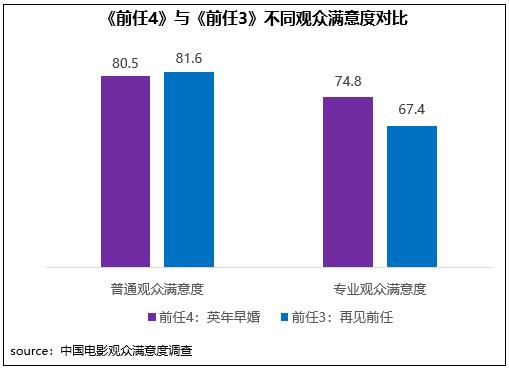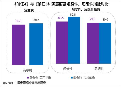 由田羽生执导,韩庚、郑恺主演的都市爱情轻喜剧电影《前任4:英年早婚》观众满意度80.1分,与六年前上映的系列上一部《前任3:再见前任》相差不大,略下降0.6分;其中二者思想性得分几近持平,观赏性下降了2.3分。