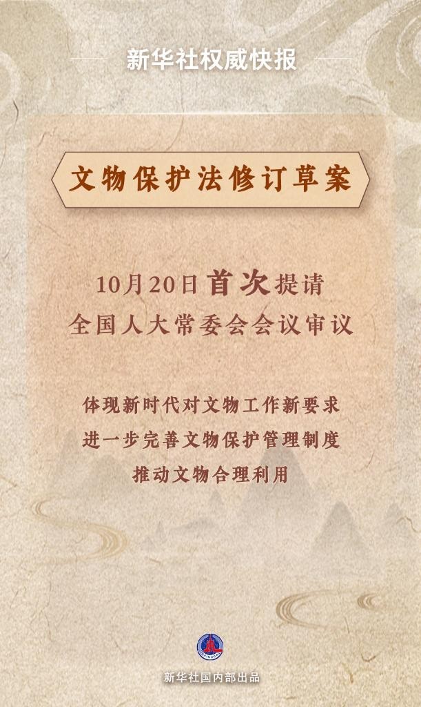 10月20日,文物保护法修订草案提请十四届全国人大常委会第六次会议首次审议。修订草案贯彻党中央决策部署,体现新时代对文物工作新要求;坚持把保护放在第一位,进一步完善文物保护管理制度;妥善处理保护和利用的关系,推动文物合理利用;多措并举加大处罚力度,严厉打击破坏文物违法行为。