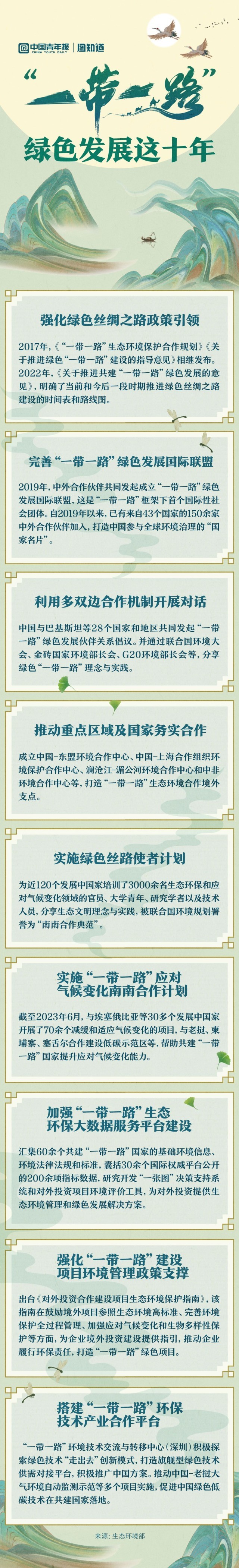 绿色已成为共建“一带一路”鲜明底色。十年来,绿色丝绸之路建设为全球环境与气候治理不断贡献力量。中国实施的绿色丝路使者计划为近120个发展中国家培训了3000余名生态环保和应对气候变化领域的大学青年、技术人员等,许多年轻人成为绿色丝路使者,为共建“一带一路”国家落实联合国2030年可持续发展议程提供方案,接力下一个十年。
