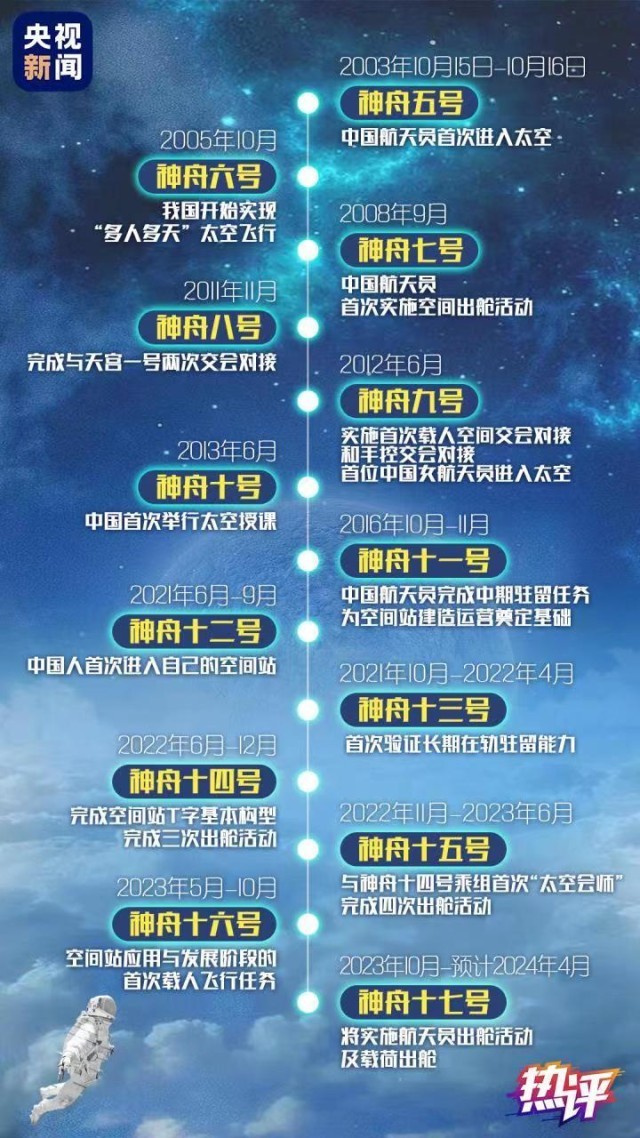 飞天20载,所向皆星河。从神五到神十七,从首次太空飞行到长期驻守空间站,20年间,我国载人航天事业实现跨越式发展,载人航天工程发射任务实现30战30捷。有太多高光时刻值得铭记,每一步都夯实基础,每一步都标定未来。
