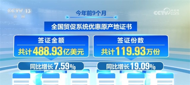 1月—9月,全国贸促系统RCEP原产地证书签证金额共计54.78亿美元,同比增长10.10%;签证份数共计15.95万份,同比增长47.15%。