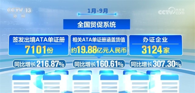 1月—9月,全国贸促系统共签发出境ATA单证册7101份,同比增长216.87%;相关ATA单证册涵盖货值约19.88亿元人民币,同比增长160.61%;办证企业3124家,同比增长307.30%。