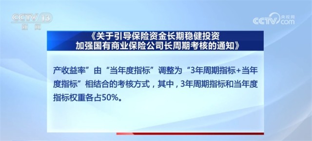 《通知》明确,为引导国有商业保险公司长期稳健经营,更好发挥中长期资金的市场稳定器和经济发展助推器作用,加强对国有商业保险公司的长周期考核,根据《财政部关于印发<商业保险公司绩效评价办法>的通知》,将经营效益指标的“净资产收益率”由“当年度指标”调整为“3年周期指标+当年度指标”相结合的考核方式,其中,3年周期指标和当年度指标权重各占50%。