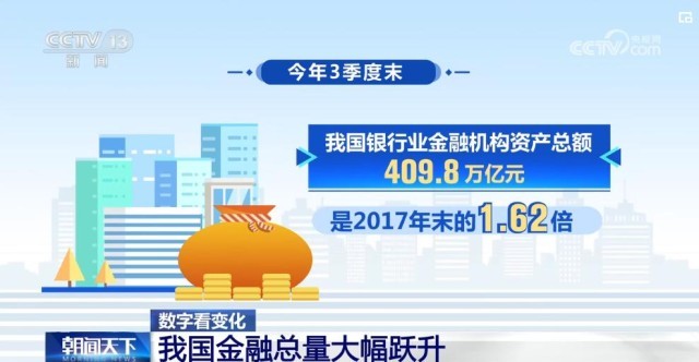 最新数据显示,今年3季度末,我国银行业金融机构资产总额为409.8万亿元,是2017年末的1.62倍。银行业金融机构本外币贷款余额239.5万亿元,是2017年末的1.91倍。本外币存款余额286.6万亿元,是2017年末的1.69倍。保险方面,3季度末,保险公司总资产29.6万亿元,是2017年末的1.77倍。从2018年到今年3季度末,保险公司赔款与给付累计支出8.4万亿元,保险的保障功能日益突出。
