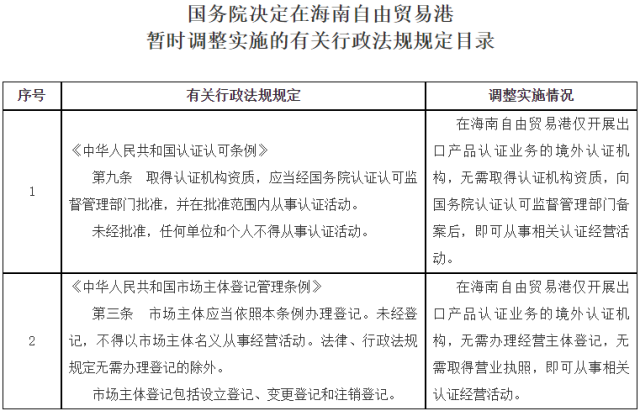 一、为支持海南自由贸易港建设,按照《海南自由贸易港建设总体方案》,同意自即日起在海南自由贸易港暂时调整实施《中华人民共和国认证认可条例》《中华人民共和国市场主体登记管理条例》有关规定(目录附后),在海南自由贸易港仅开展出口产品认证业务的境外认证机构,无需取得认证机构资质和办理经营主体登记,向国务院认证认可监督管理部门备案后,即可开展出口产品认证业务,认证结果仅限出口企业境外使用。备案条件和程序由国务院认证认可监督管理部门制定。