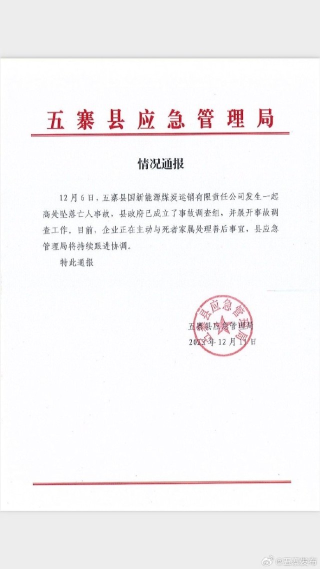 国新能源煤炭运销公司发生坠亡事故 山西省忻州市五寨县官方:展开调查