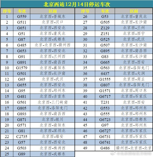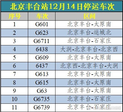 受降雪影响 北京西站、北京丰台站12月14日60趟列车停运
