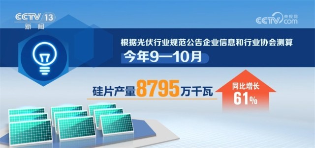 央视网消息:工业和信息化部昨天(12月13日)发布当前全国光伏制造行业最新运行情况。数据显示,今年9—10月,我国光伏制造业保持高位运行,硅料、硅片、电池、组件产量同比增长均超60%。