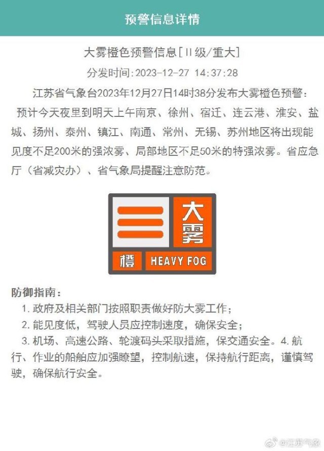 央视网消息:据@江苏气象 微博消息,江苏省气象台2023年12月27日14时38分发布大雾橙色预警: 预计今天夜里到明天上午南京、徐州、宿迁、连云港、淮安、盐城、扬州、泰州、镇江、南通、常州、无锡、苏州地区将出现能见度不足200米的强浓雾、局部地区不足50米的特强浓雾。江苏省应急厅(省减灾办)、省气象局提醒注意防范。