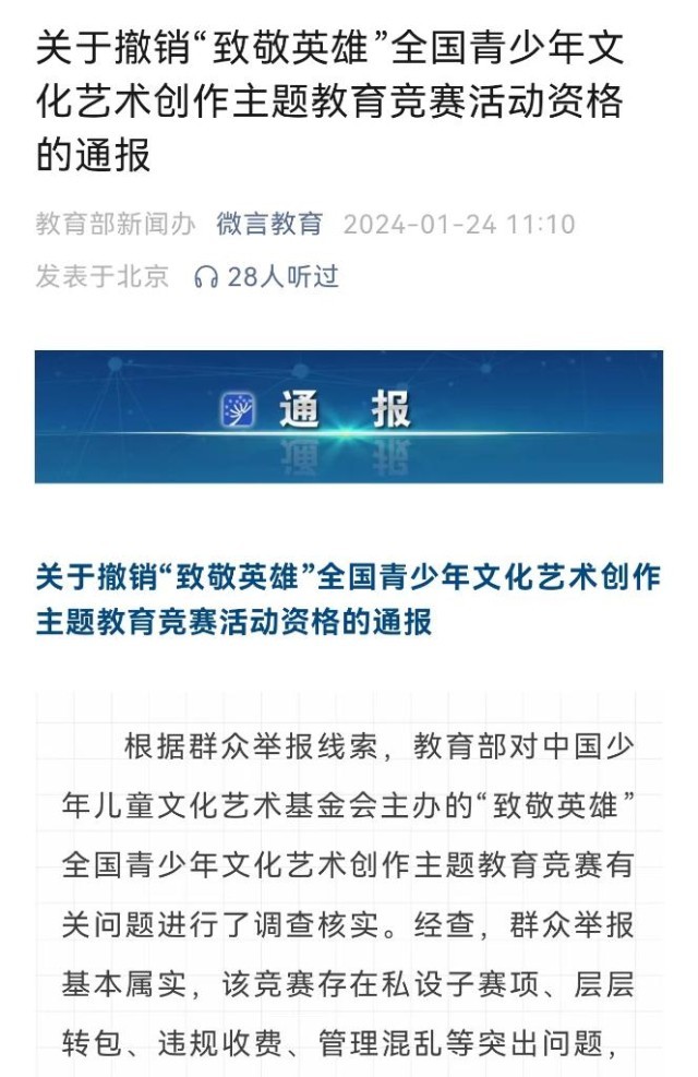 教育部1月24日通报,根据群众举报线索,教育部对中国少年儿童文化艺术基金会主办的“致敬英雄”全国青少年文化艺术创作主题教育竞赛有关问题进行了调查核实。经查,群众举报基本属实,该竞赛存在私设子赛项、层层转包、违规收费、管理混乱等突出问题,在社会上造成了恶劣影响。